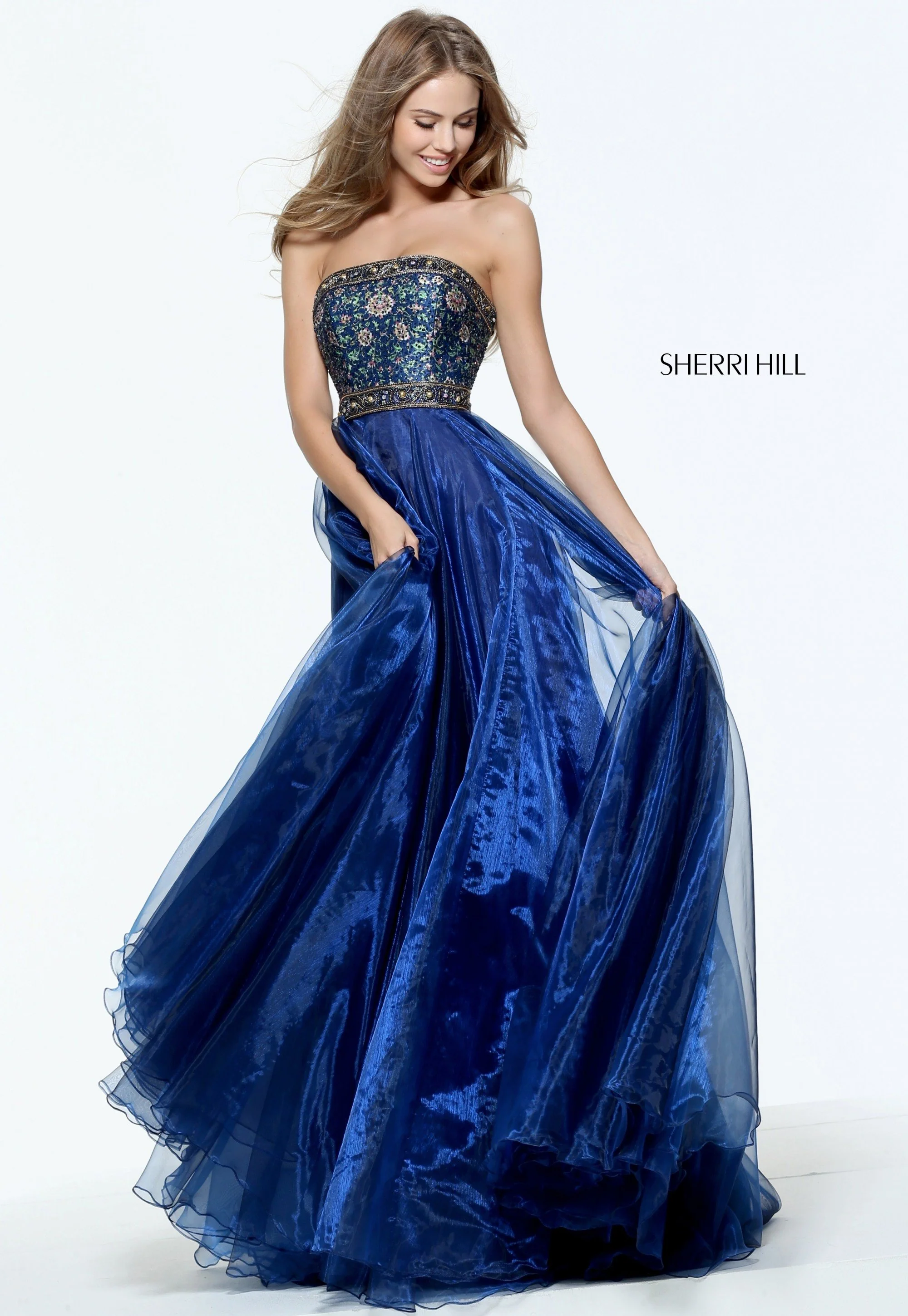 Printed strapless beaded bodice with A-line organza skirt.