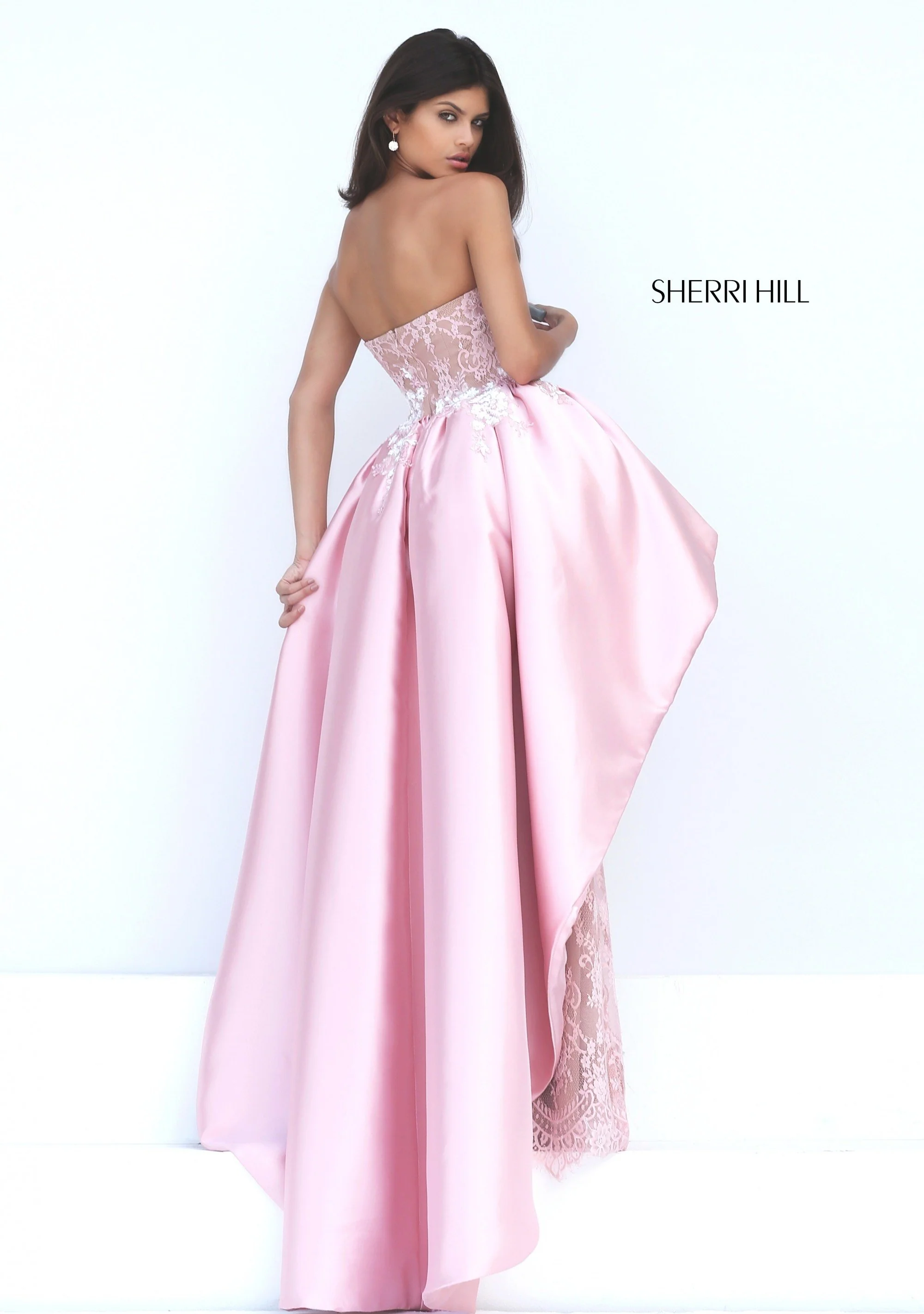 Strapless lace column with taffeta overskirt.