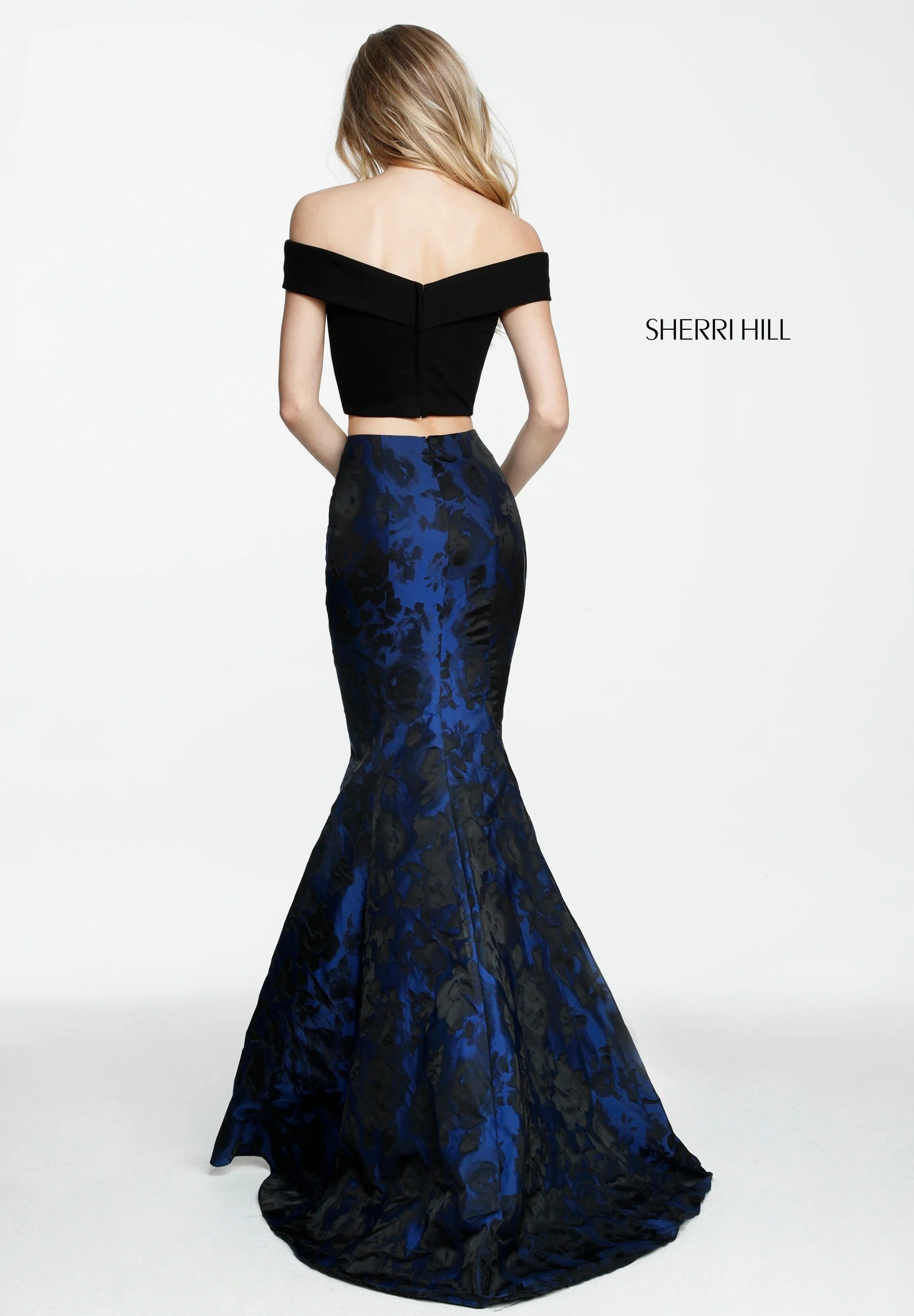 Two-piece mermaid with an off-the-shoulder bodice and jacquard print skirt.