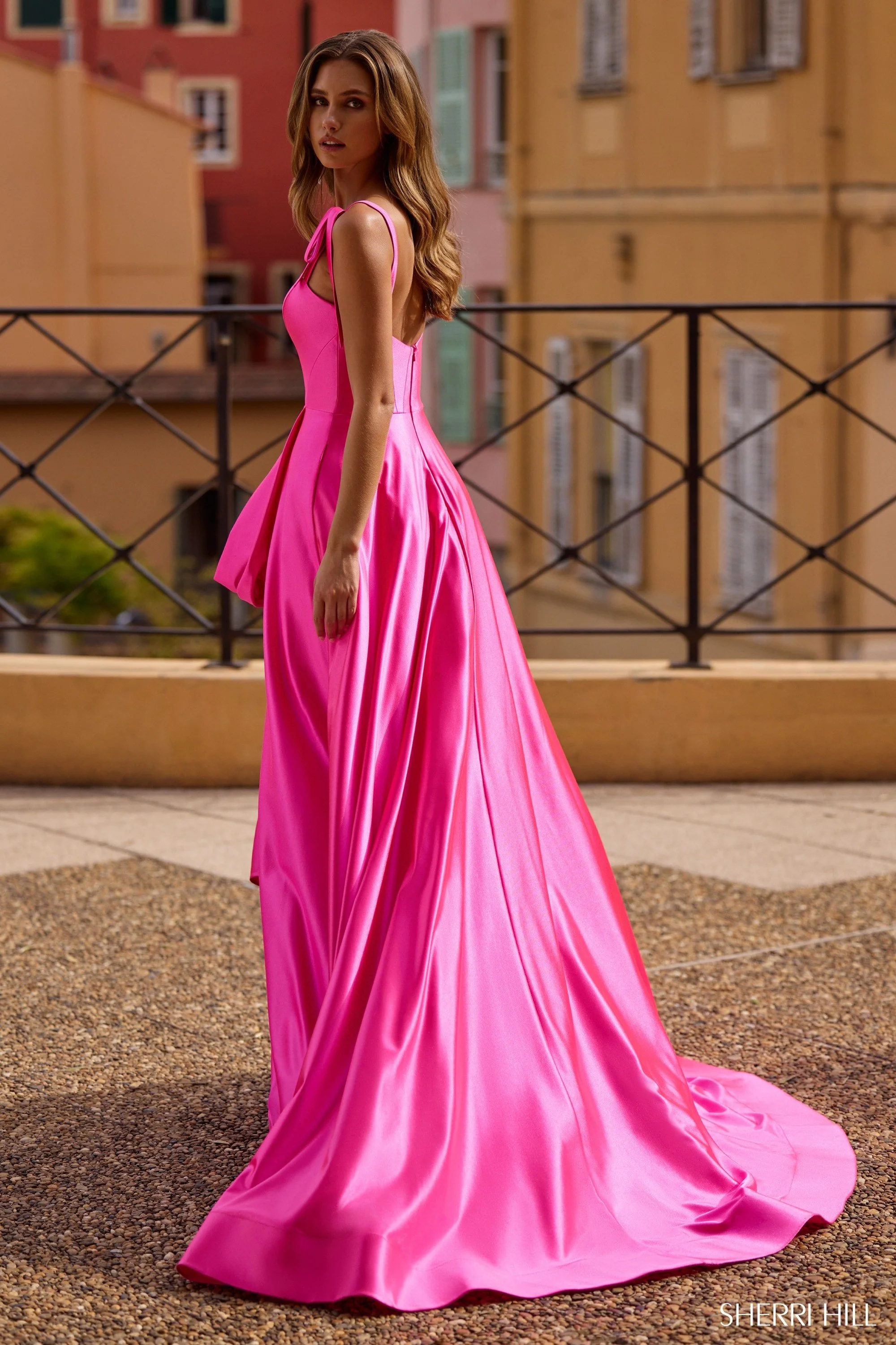 Slinky stretch A-Line gown with sweetheart neckline, bow straps and high slit.